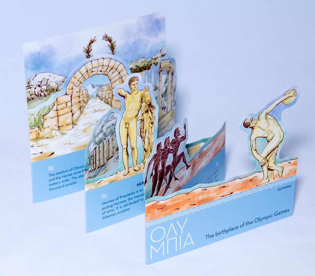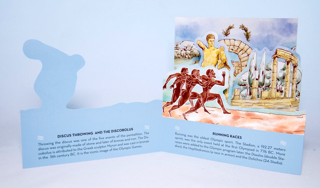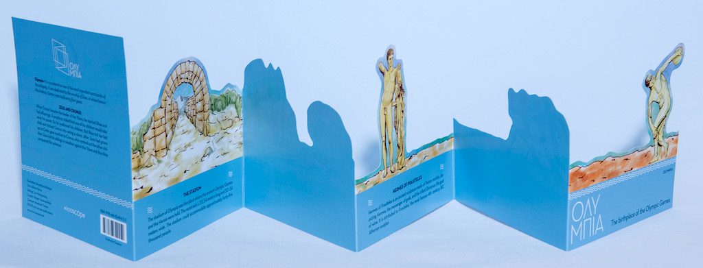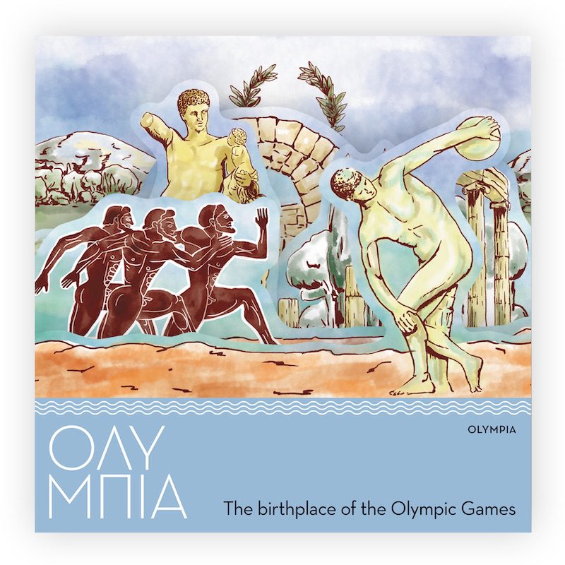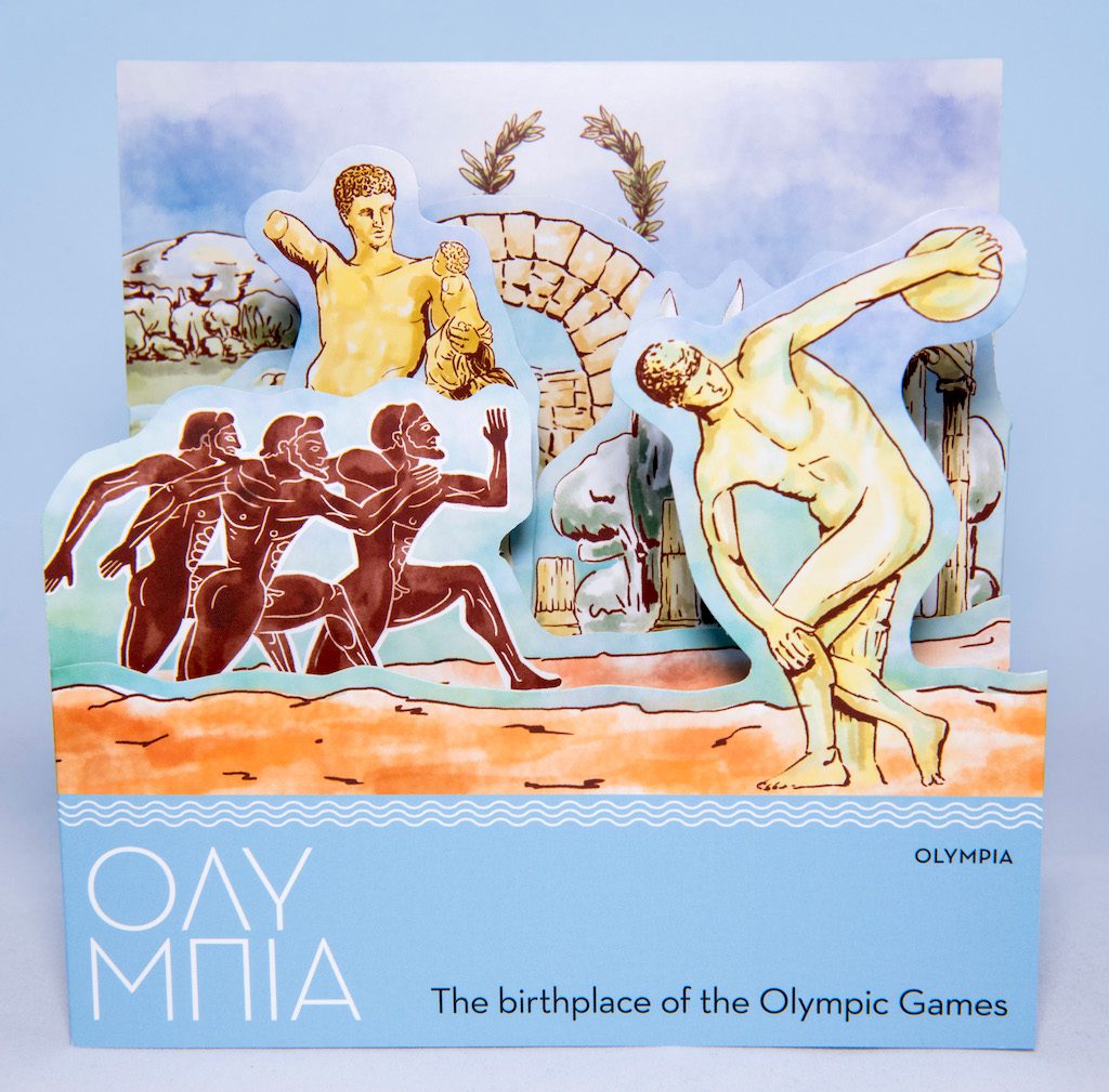 Ένα σύντομο τρισδιάστατο βιβλίο ακορντεόν για την Ολυμπία, τη γενέτειρα των Ολυμπιακών αγώνων, με πληροφορίες για τα σημαντικότερα αξιοθέατα.